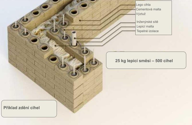 Při zdění se používá mrazuvzdorné obkladové lepidlo, které lze nanášet pistolí, válečkem nebo i jednoduchým dávkovačem. Otvory umožňují vést elektroinstalaci, vkládat výztuž nebo je vyplnit betonem pro zesílení konstrukce. Pevností může lego cihla překonat keramickou až o 50 %, a přitom zůstává lehčí.