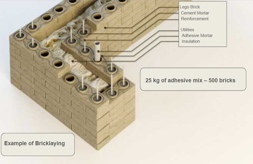 Beim Mauern wird frostbeständiger Fliesenkleber verwendet, der mit einer Kartuschenpistole, einer Rolle oder sogar mit einem selbstgebauten Spender aufgetragen werden kann. Die Löcher können für die Verlegung von Elektrokabeln, das Einsetzen von Bewehrung oder das Ausfüllen der Hohlräume mit Beton zur Verstärkung der Konstruktion genutzt werden. In Bezug auf die Festigkeit kann der Lego-Stein den keramischen Ziegel um bis zu 50% übertreffen und bleibt dabei dennoch leichter.
